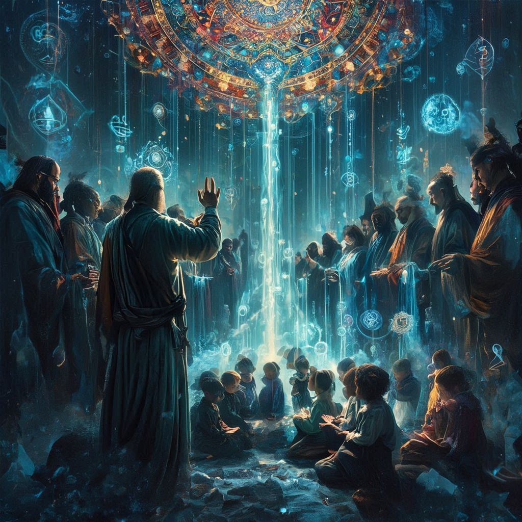 青い光の柱が降り注ぐ中、子どもたちと霊的長老たちの間で教える浄心先生。